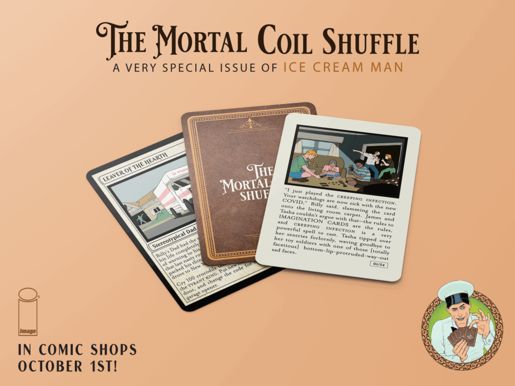 So, how does a comic book work as a deck of cards? The team has meticulously designed Ice Cream Man: The Mortal Coil Shuffle to be a complete narrative experience. The deck will arrive in a custom box, and each of the 55 cards will feature new art from Morazzo and O’Halloran, with lettering and design by Good Old Neon.