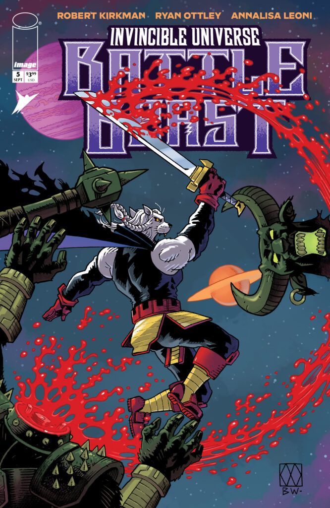 The blood-soaked, record-breaking series continues as we get our first look inside Invincible Universe: Battle Beast #5, and the biggest question on every fan’s mind is: has the galaxy’s greatest warrior finally met his match? From the legendary Invincible creative team of writer Robert Kirkman and artist Ryan Ottley, this new series from Skybound and Image Comics has been one of the most demanded stories in the franchise’s history. It dives deep into the secret origin of the fan-favorite feline brawler, Prince Salaka, better known as Battle Beast.