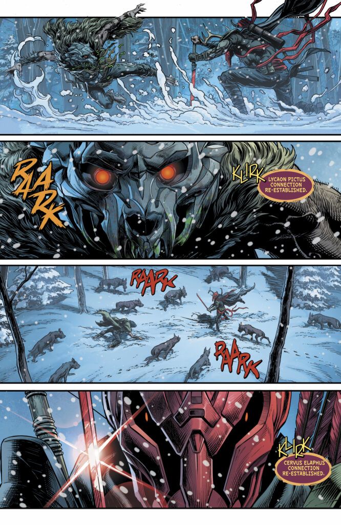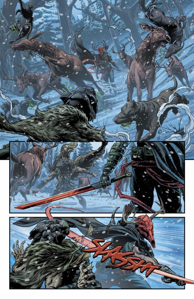 The new story arc beginning in Rook: Exodus #7 finds Rook, Dire Wolf, and their fellow Wardens on a desperate quest. Their mission is to save Dire Wolf’s father, Bloodhound, the one man who might hold the key to preventing the complete collapse of Exodus. However, as artist Jason Fabok describes him, Bloodhound has been “driven mad by the instinct influence of his mask,” likening the character to a “rabid dog” stalking the frozen North. Freeing him from the animalistic influence he’s tied to will be a monumental challenge.