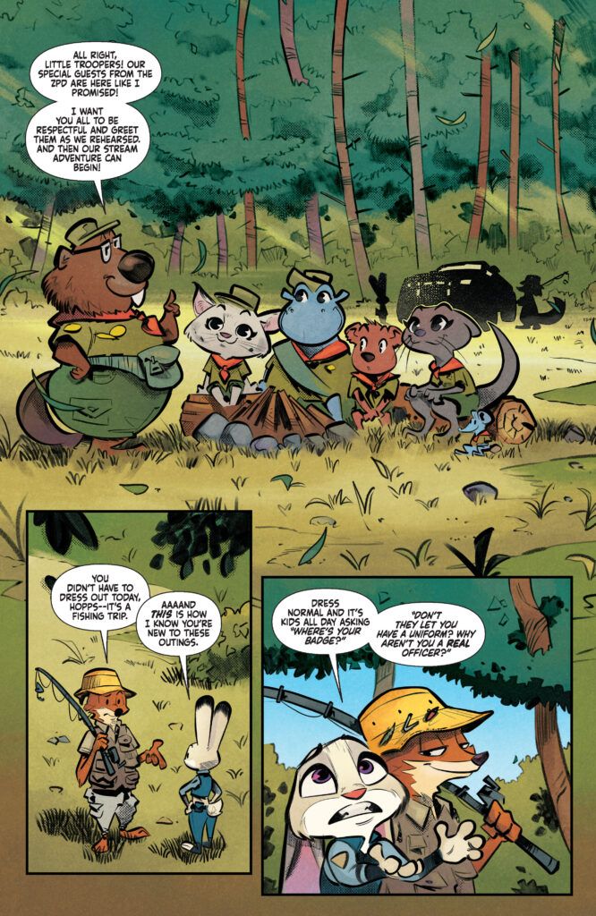 The central plot of Zootopia #5 revolves around the scout troop and their enigmatic Den Mother. While Nick, drawing on his own past as a scout, is quick to bond with the kids and help them with their survival skills, Judy’s sharp instincts tell her something is amiss. Her suspicions are piqued by the Den Mother’s curriculum, which seems to involve an unusual amount of panning for gold. This creates a fantastic dynamic between our two heroes: Nick’s nostalgia and desire to connect with the kids blinds him to the potential danger, while Judy’s by-the-book detective work drives her to uncover the truth.