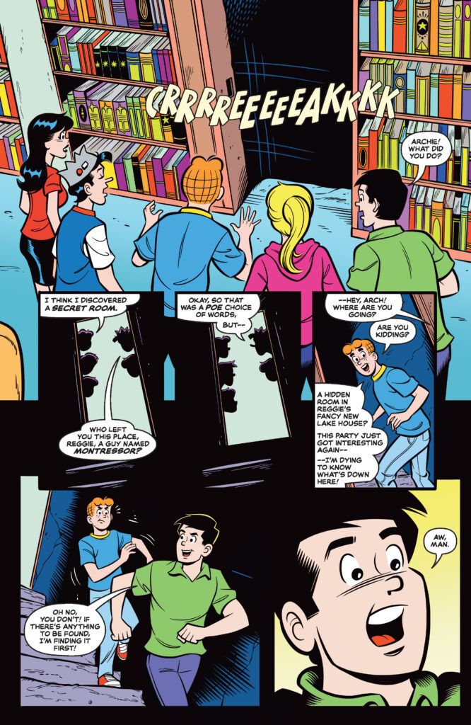 Consequently, the impact triggers a hidden mechanism that reveals a secret room behind a bookshelf. Meanwhile, despite the protests of Betty Cooper and Veronica Lodge—who both feel the room gives them “the creeps”—Archie and Reggie rush inside to explore. In addition to the dust and cobwebs, they find a desk piled with strange books and sticky notes. On top of the pile sits the Necronomicon Ex Mortis, bound in flesh and inked in blood.