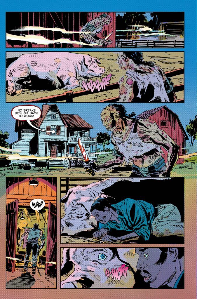 The artwork by Dean Kotz is particularly noteworthy, capturing the gritty reality of the farm while maintaining the kinetic energy required for a horror chase. Allison Hu’s colors bring a muted, oppressive palette that mirrors the in-game experience perfectly.
