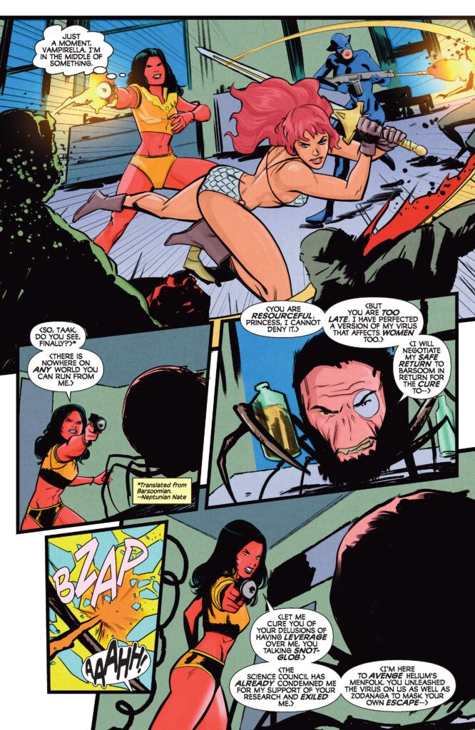 The interaction between these iconic characters is the heartbeat of the issue. While they are forced to work together to stop the secondary infections from sweeping the globe, their personal dramas often threaten to derail the mission. Consequently, every reversal and betrayal feels earned. Meanwhile, the Martian forces are not going down without a fight, unleashing a level of destruction that tests the limits of Sonja’s sword and Vampirella’s fangs.