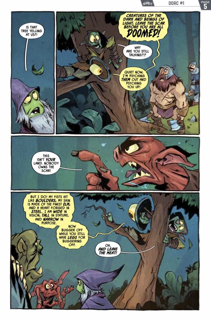 What readers should prepare for in D’orc #2 is a narrative that continues to subvert the tropes of epic fantasy with a healthy dose of deadpan humor. Our protagonist is a lonely orphan who happens to be half dwarf and half orc—a biological combination that makes him “wholly inconvenient” to a world-ending doomsday prophecy. Fated to destroy everything, D’orc is currently busy trying to avoid every wizard and warrior convinced that killing him is a moral necessity.