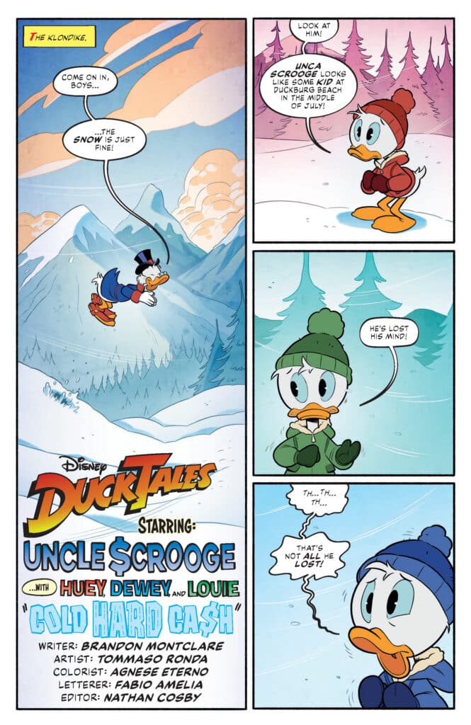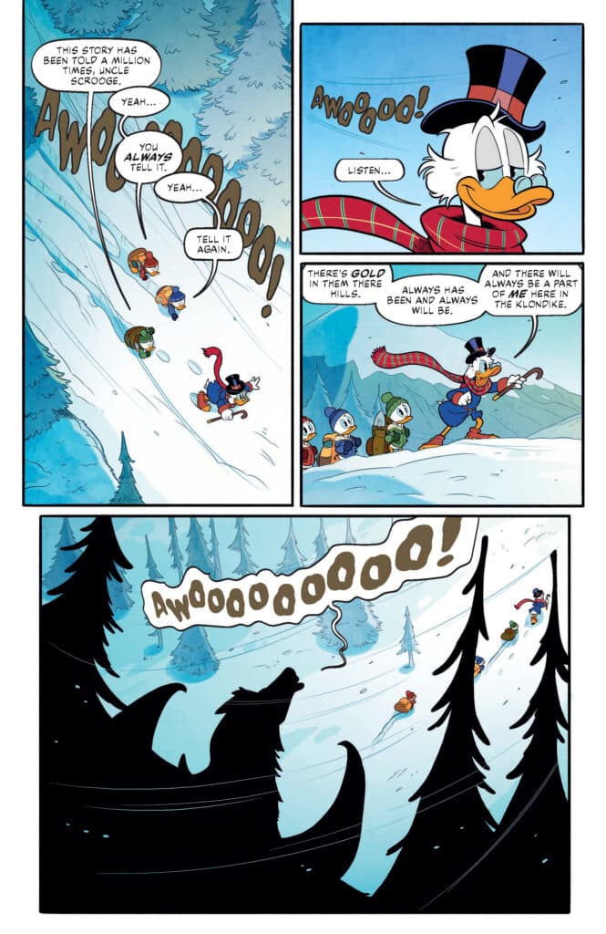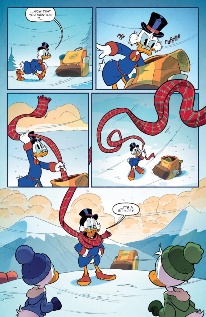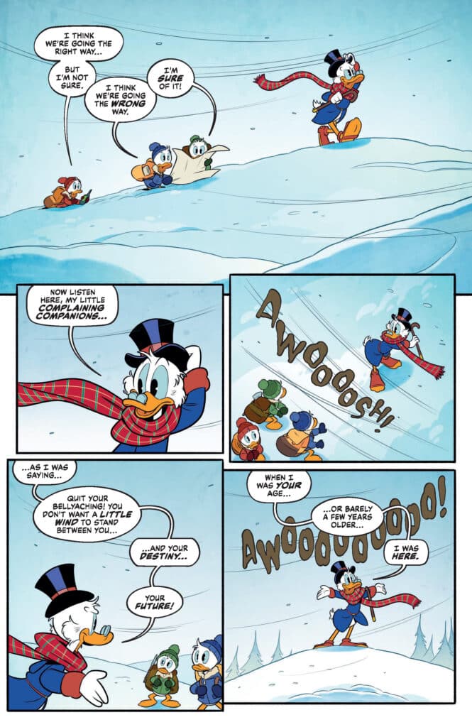 What readers should prepare for in DuckTales #11 is a narrative that masterfully balances humor with a genuine sense of peril. Brandon Montclare’s script captures the eccentricities of Scrooge’s personality perfectly, highlighting his relentless drive and his occasional moments of pensive reflection. Transitioning from the high-tech security of the Money Bin to the raw, untamed wilderness of the North provides a stark contrast that keeps the reader engaged. Meanwhile, the interaction between Scrooge and his nephews provides the emotional core, as the boys witness a side of their uncle they’ve only heard about in stories.