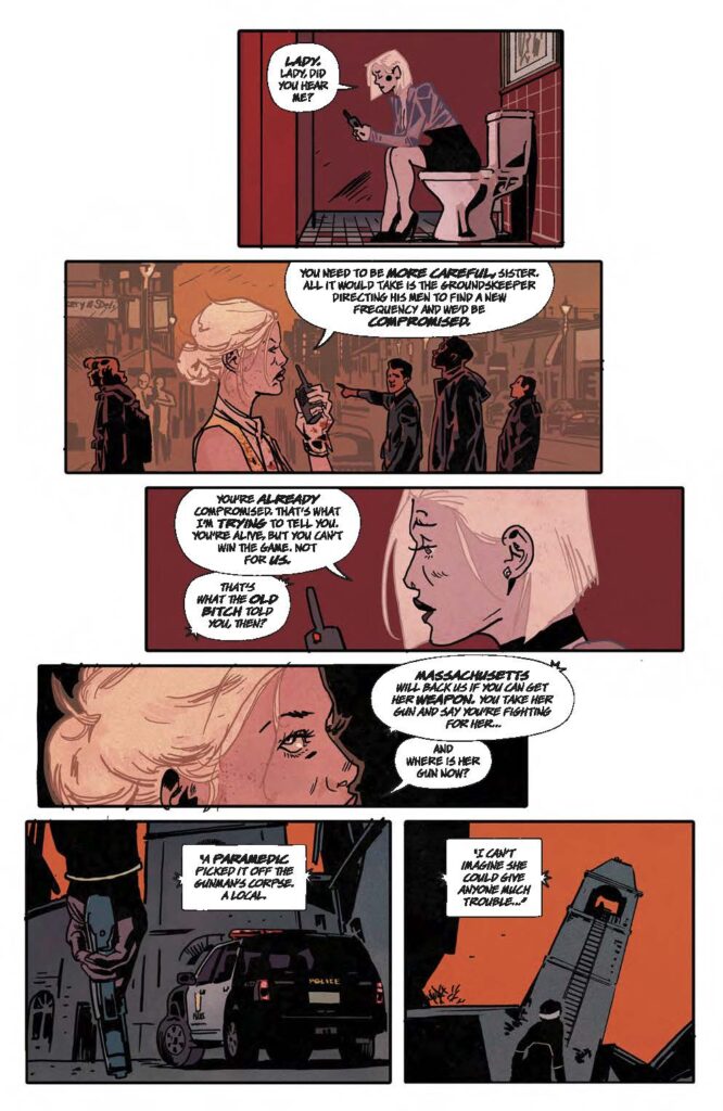 Furthermore, the issue utilizes the dialogue to heighten the sense of a massive, bureaucratic conspiracy. The search for a specific “weapon”—a gun picked off a gunman’s corpse by a local paramedic—suggests that even the smallest variables are being tracked by the organizers. As a “Sister” is warned that she is already “compromised,” the reader realizes that the internal hierarchy of this game is far more complex than a simple win or loss. The “groundskeeper” directing his men to a new frequency emphasizes the technological advantage the villains hold over their prey.