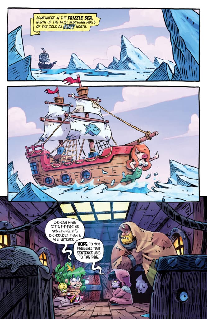 What readers will find most striking in I Hate Fairyland #48 is the shift in setting. The issue opens “somewhere in the Frizzle Sea, north of the most northern parts of the cold as fluff north.” The environmental storytelling immediately conveys a sense of freezing dread, as characters huddle together for warmth. The dialogue—featuring lines like “It’s c-c-colder than a w-w-witches—” before being cut off—is exactly the kind of meta-humor that fans adore.