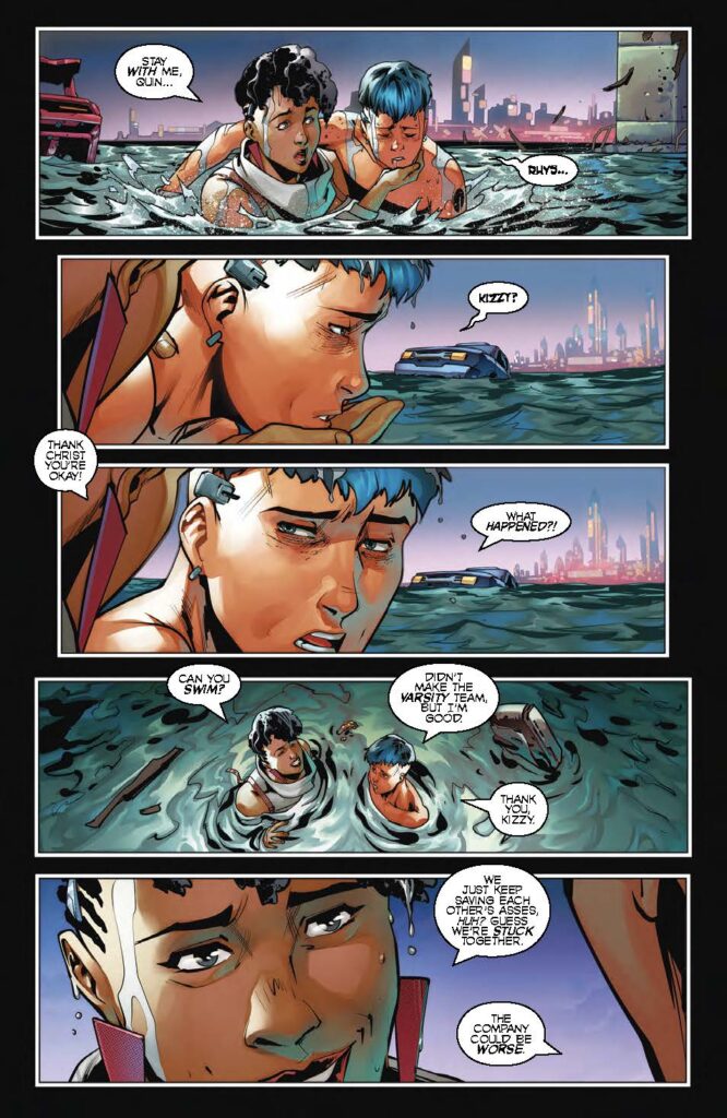What readers will find most compelling in Rat City #22 is the relentless pace of the action. The issue opens with a visceral struggle in the water, highlighting the vulnerability of Peter Rhodes even with his supernatural abilities. As Peter struggles to stay with his companion, Quin, the reader is pulled into a chaotic scramble for survival. The dialogue—featuring frantic shouts like “Stay with me!” and “I hate the water!”—grounds the supernatural elements in raw, human desperation.