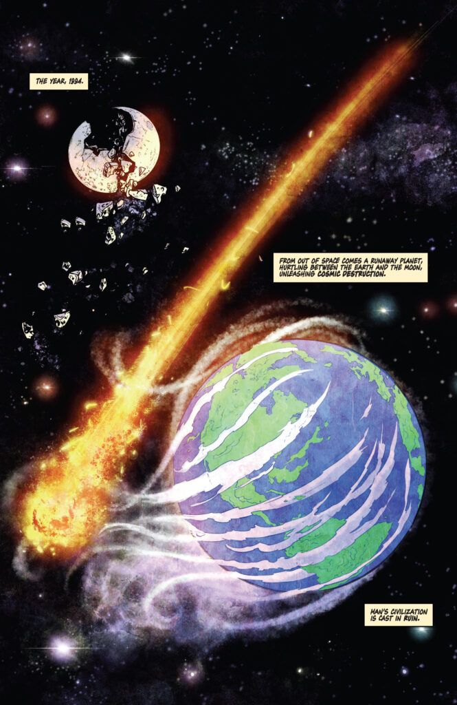 The issue opens with a stark reminder of how the world ended. In the year 1994, a runaway planet hurtles between the Earth and the Moon, unleashing cosmic destruction that casts mankind’s civilization into ruin. The art by Kewber Baal captures this cataclysm with terrifying scale, showing the moon shattering in the night sky.
