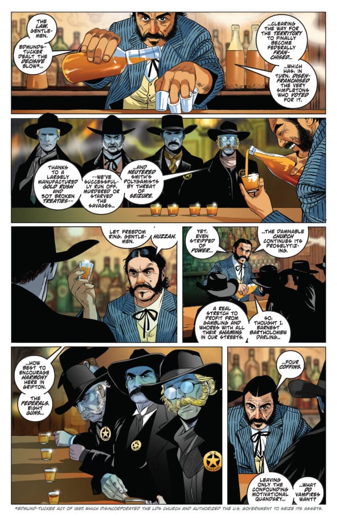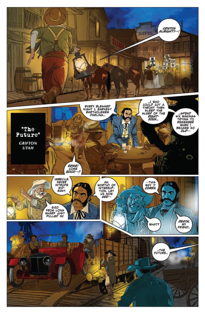 What readers should prepare for in Vampirella #11 is a narrative that effortlessly blends the tropes of the Western with the visceral elements of horror. Christopher Priest’s script captures the dry wit and tactical mind of Vampirella as she assesses her new surroundings. Transitioning from the high-tech and magical threats of the modern day to the dusty, lawless trails of the frontier provides a stark contrast that highlights the character’s adaptability. However, she soon discovers that she isn’t the only apex predator in this time period.