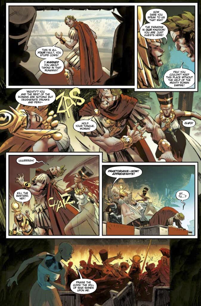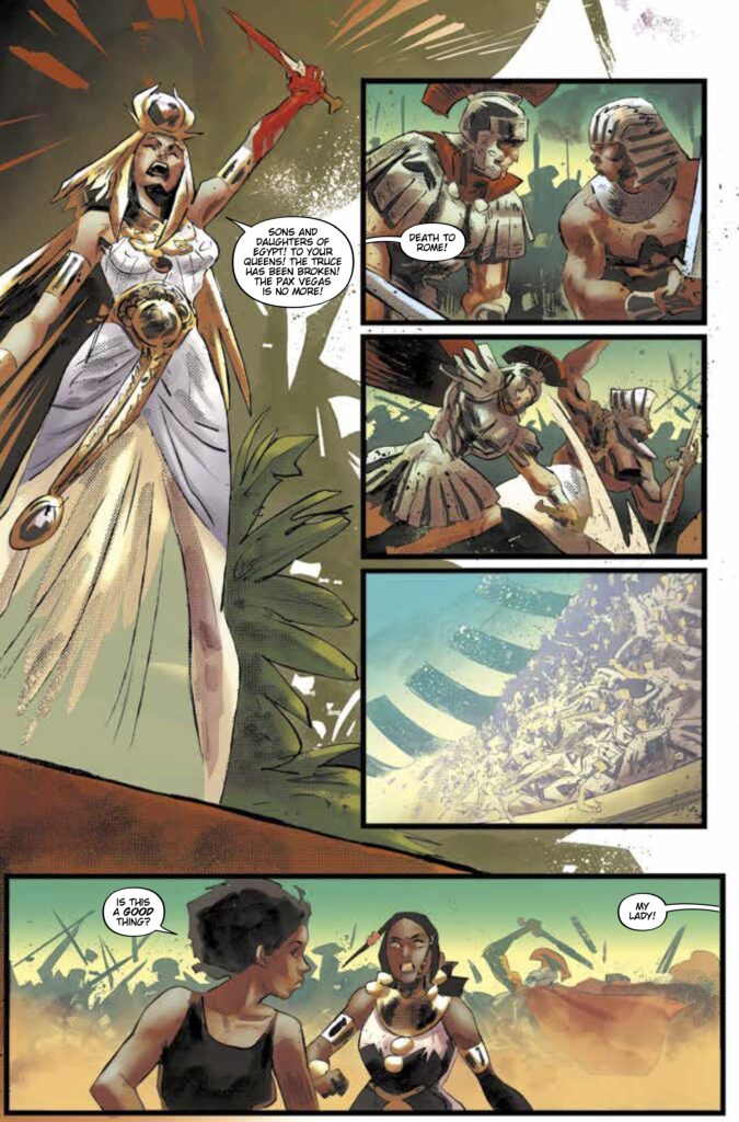 What readers should prepare for in Blade Runner Black Lotus: Las Vegas #4 is a story that explores the “discarded” elements of society. In the wake of a dirty bomb detonation, Las Vegas has become a sand-choked ghost town of forgotten memories. Within this wasteland, Elle encounters a unique community of Replicants—abandoned hospitality models who have reimagined themselves as embodiments of ancient Egyptian and Roman royalty. This pensive look at identity and reinvention provides a layer of philosophical depth that is a hallmark of the franchise.