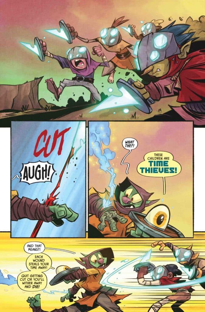 Visually, D’orc #2 is a spectacular achievement for Brett Bean. One of the most intriguing additions to the mythos is the introduction of “Time Thieves.” These aren’t cosmic entities or ancient gods; they are a group of children whose very touch can wither a warrior away. Every cut and every wound they inflict literally steals time from their victim’s life. Rendering a group of “adorable” children as a lethal, ticking clock for the protagonist requires a level of artistic authority that Bean delivers with dark humor and flair.