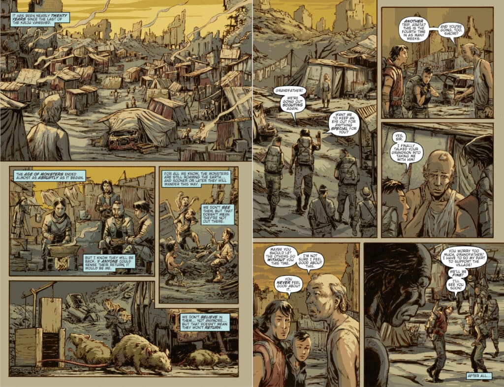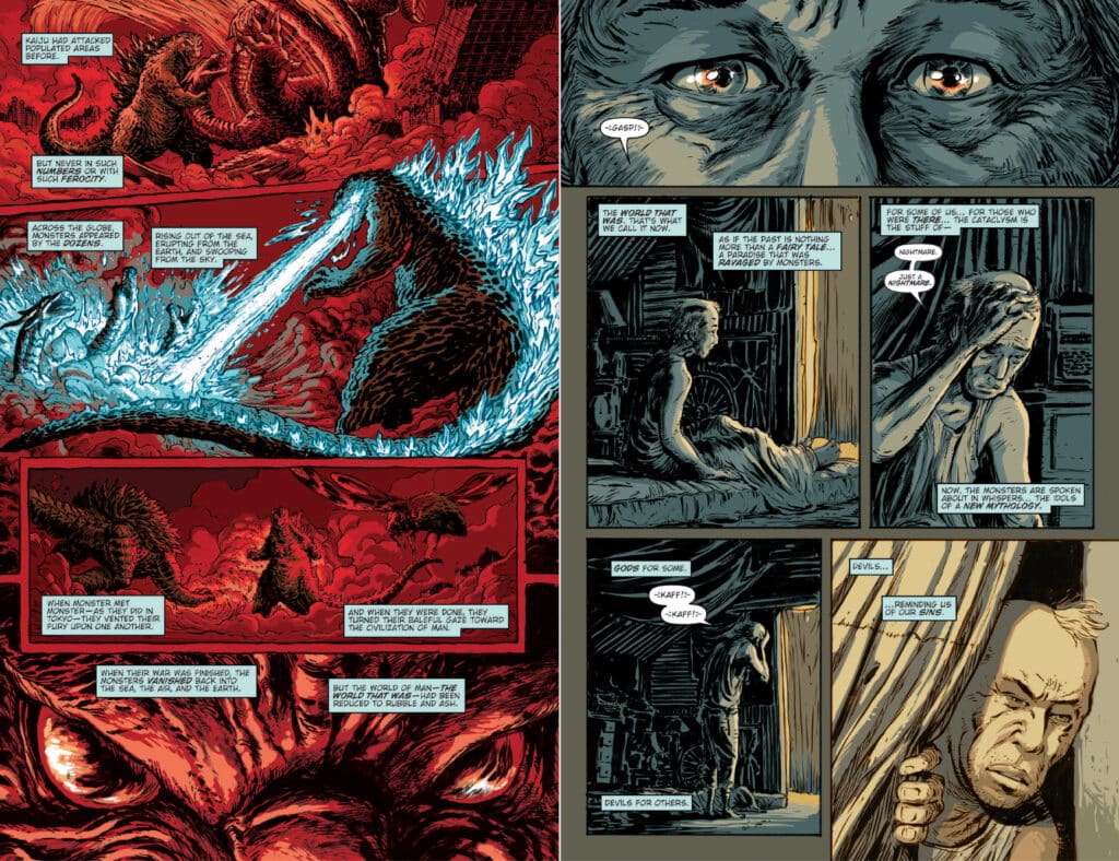 What readers should prepare for in Godzilla Library Collection, Vol. 6 is a trio of narratives that push the boundaries of what a “giant monster comic” can be. The first featured arc, Cataclysm by Cullen Bunn and Dave Wachter, takes place years after a monster apocalypse nearly destroyed mankind. The story focuses on Hiroshi, an elder in a struggling tribe who views the monsters as a distant nightmare. However, as the apocalypse begins to restart, Hiroshi realizes that his memories of the past are the only things that can save the future. Transitioning from quiet survival to high-stakes chaos, Cataclysm remains a pensive favorite for many.