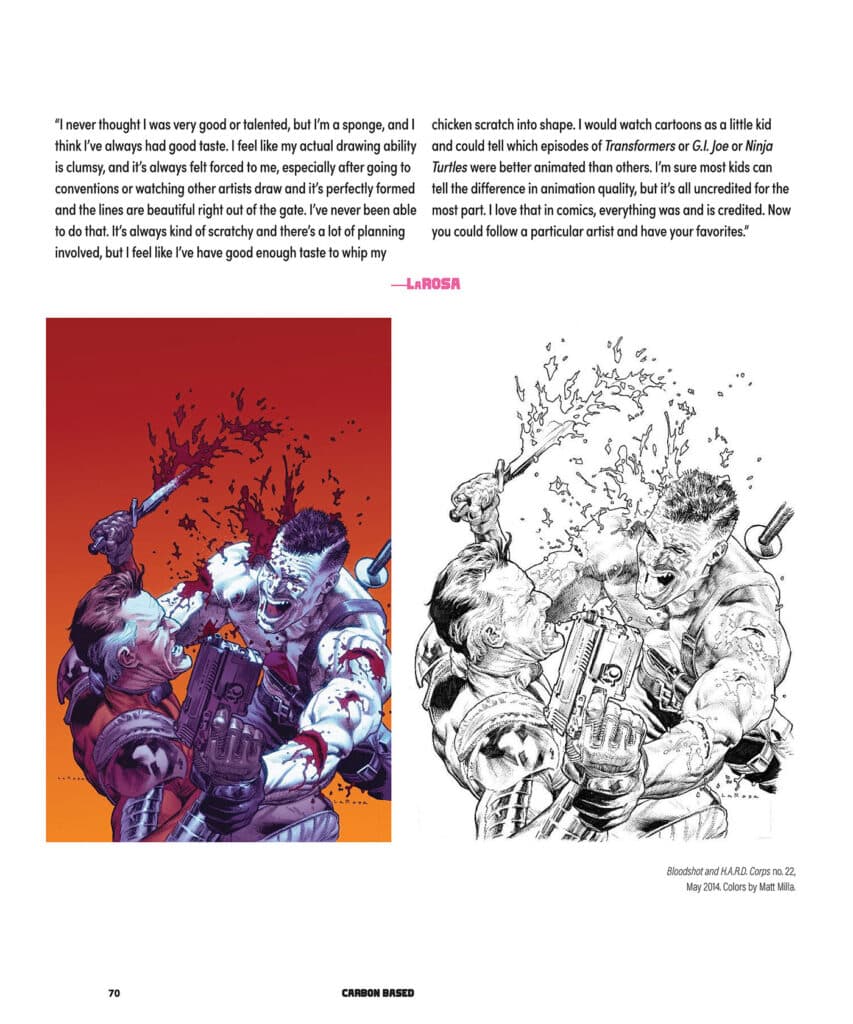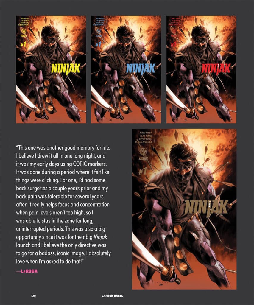 Visually, the celebration of Lewis LaRosa begins even sooner with the CARBON BASED retrospective, out now. This 256-page hardcover is an extraordinary achievement, featuring page-by-page commentary by LaRosa and former Valiant editor-in-chief Warren Simons. The volume utilizes the unique strengths of the medium to explore the “process” of a master, with appreciations from industry legends including Lee Bermejo, Dave Johnson, and Jeff Lemire.