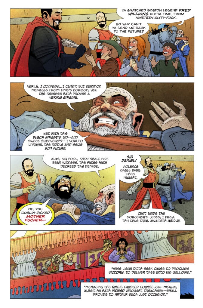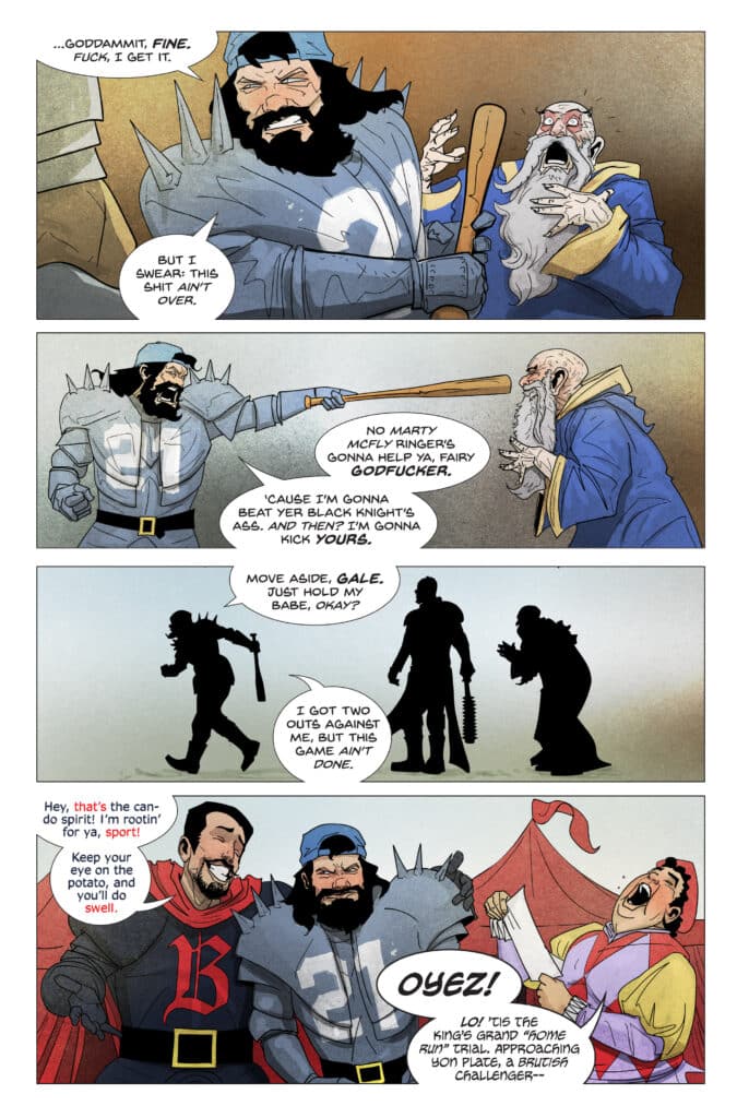 What readers should prepare for in Medieval #5 is a narrative that flips the script on traditional Arthurian combat. The issue finds Danny Landau in the “bottom of the ninth” with two outs, facing down King Arthur’s Black Knight in a batting contest that will decide the fate of his neck and his relationship. However, a significant complication arises as the Black Knight is revealed to be more than just a suit of armor; he is secretly one of history’s greatest professional home run kings. This twist shifts the hierarchy of the duel, turning a physical struggle into a psychological Merlin-influenced war of attrition.