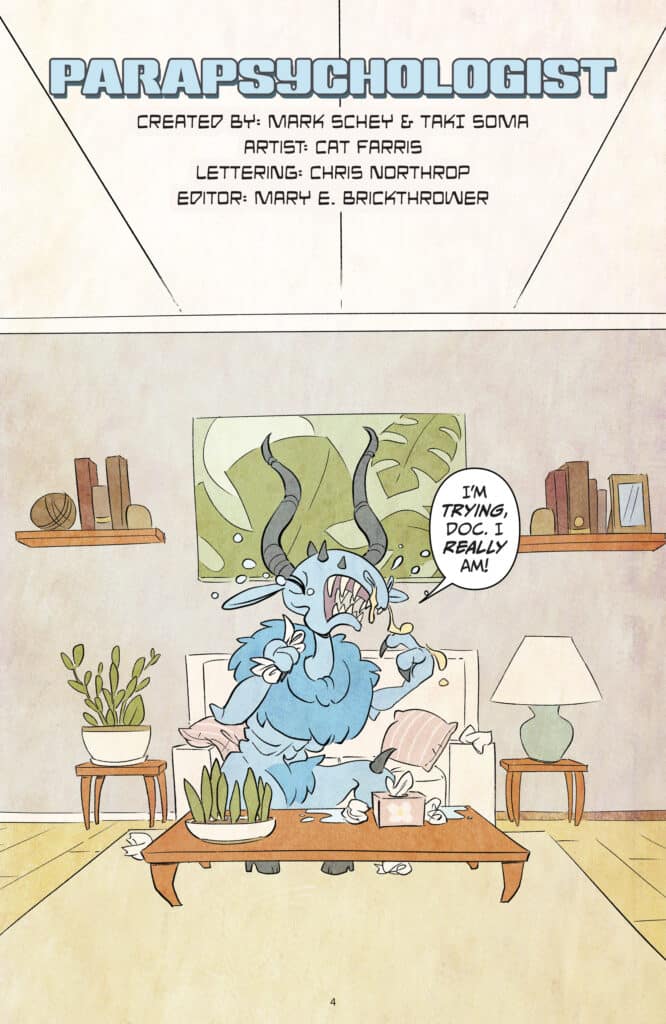 What readers should prepare for in the Parapsychologist OGN Preview is a narrative that finds its heart in the professional vacuum of the “unlikely psychologist.” Dr. Ron Richards isn’t dealing with standard human anxieties; his waiting room is a diverse mix of Bigfoots (Bigfeet?), the Loch Ness Monster, and weeping blue demons. The issue highlights the investigative challenge of helping a patient who literally sees a monster in the mirror—because they are one. Transitioning from the quiet, clinical atmosphere of the office to the sudden, visceral outbursts of a supernatural breakdown keeps the reader constantly engaged.