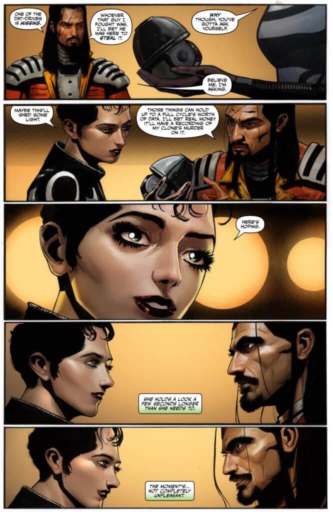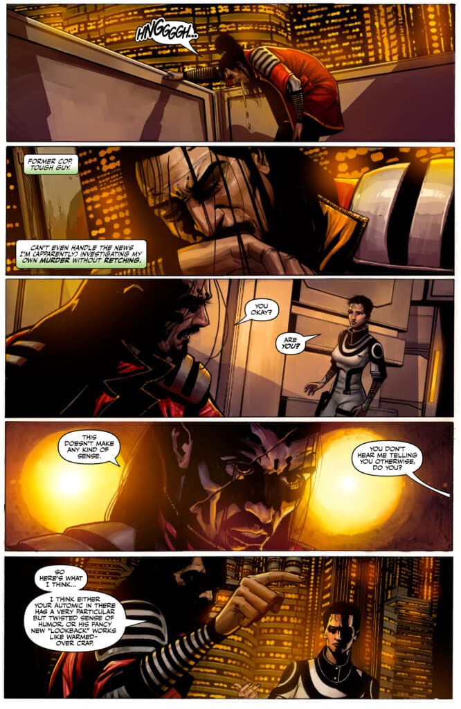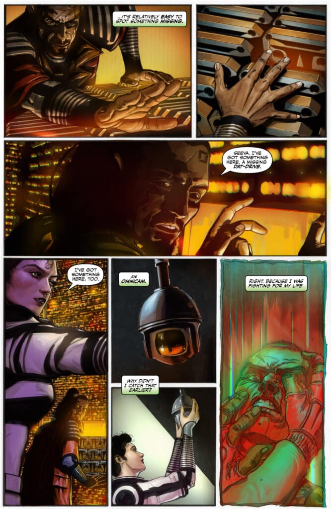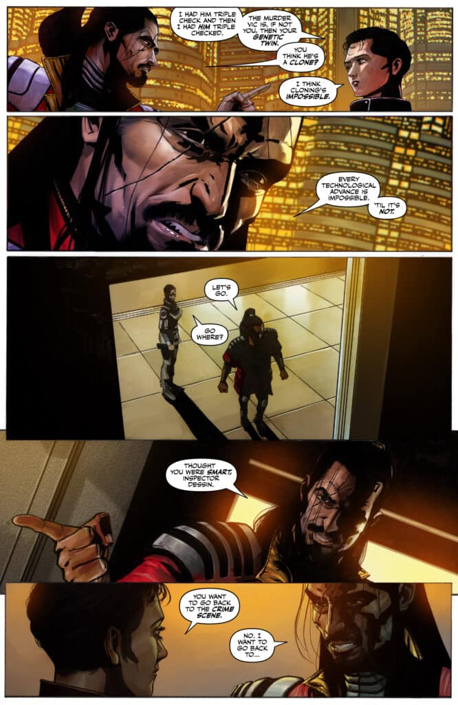 Marc Guggenheim has earned immense authority for his ability to weave intricate, multi-layered plots that demand the reader’s full attention. In this issue, Inspector Axel Jindari is forced to confront the impossible news that he is investigating his own murder. By pairing this high-concept hook with the gritty reality of the Shattered Realm, Guggenheim creates a narrative energy that is both relentless and pensive. Transitioning from the sterile offices of the Carabinieri to the grimy underworld of Imprimata, the series highlights the vibrant and flexible nature of modern sci-fi noir.