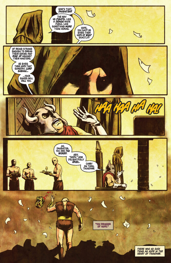 The pacing of the issue allows for a deeper look at the pensive internal life of Thundarr himself. Between the “raw and relentless” battles in the arena, we see a man haunted by the “ghosts that came in the night.” This psychological depth is a welcome addition to the franchise, transforming the character from a simple action hero into a complex survivor of a global catastrophe. Meanwhile, the dialogue between the wizards—specifically Lord Sabian and his daughter—highlights a “delightfully cruel” hierarchy of power where humans are viewed as worthless savages.