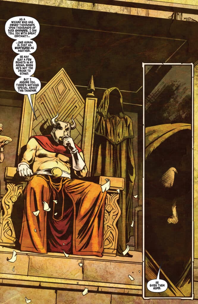 Jason Aaron has earned immense authority in the fantasy genre, and his work on this series shows a deep reverence for the original Jack Kirby and Alex Toth designs. In this second chapter, the magic-wielding wizards who rule the ruins of our world are no longer content with ruling their individual fiefdoms. Consequently, they are banding together to consolidate their grip on the downtrodden, creating a united front that even a barbarian of Thundarr’s stature may find impossible to overcome.
