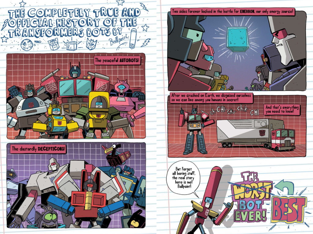 TRANSFORMERS: Worst Bot Ever–Bot Swap! is officially set to bring a “more than meets the eye” level of comedy to the Autobot ranks this summer. Today, Skybound Entertainment and Image Comics, in partnership with Hasbro, revealed a first look at the highly anticipated sequel to Meet Ballpoint!. This new middle-grade original graphic novel (OGN) promises to raise the stakes—and the absurdity—as our favorite underdog bot finds himself in the most intimidating body in the galaxy.