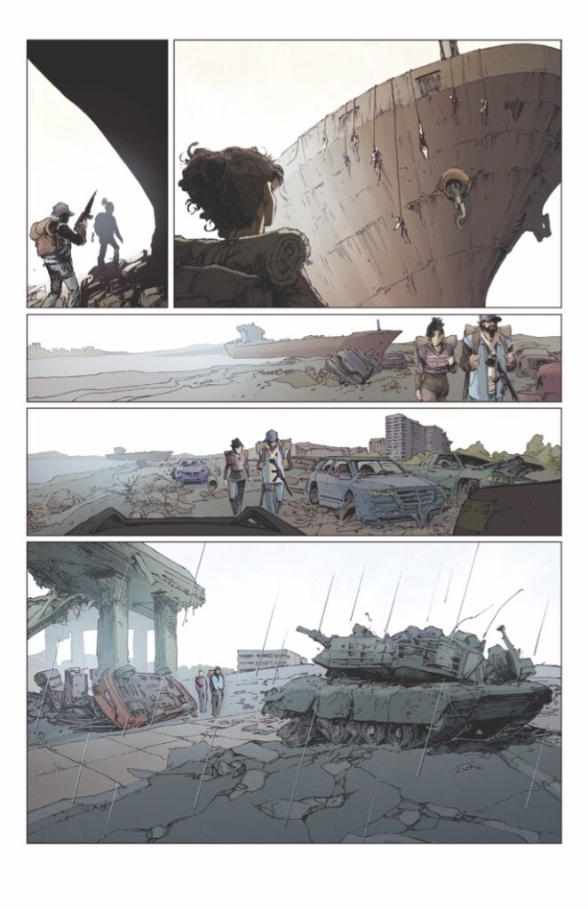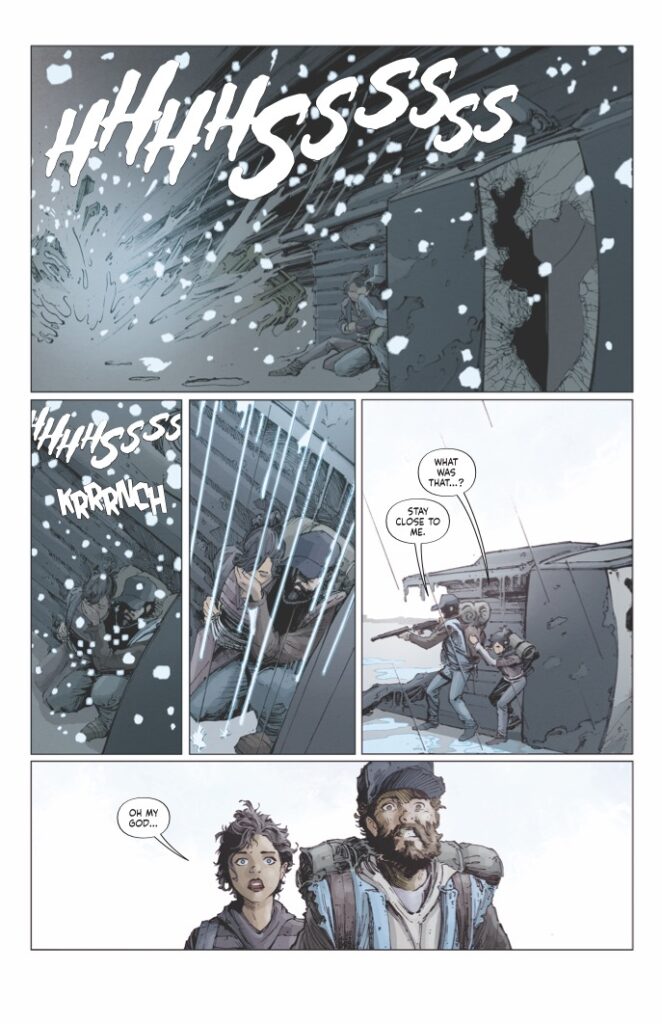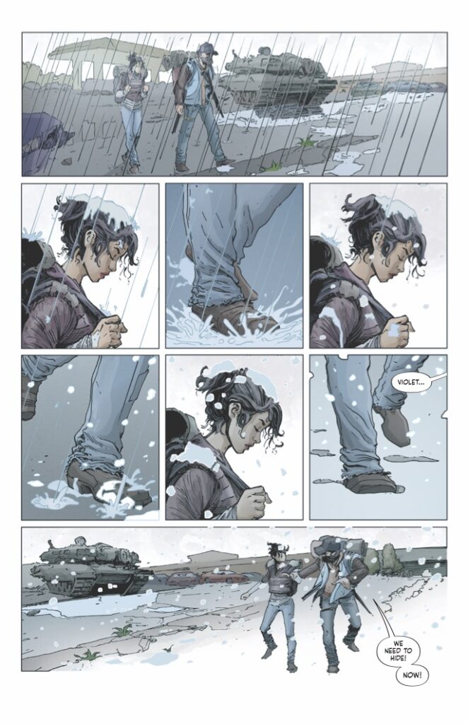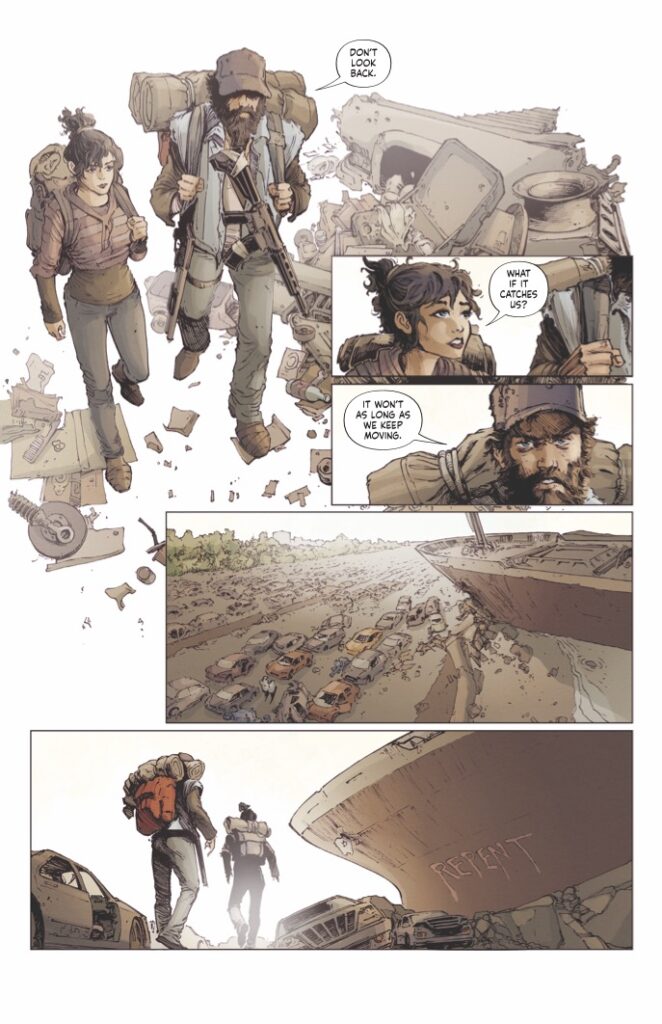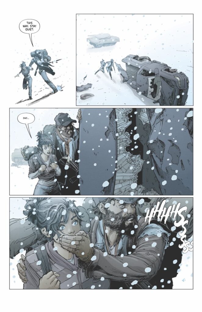 Visually, White Sky #1 is a spectacular achievement for the medium. JP Mavinga’s art, complemented by the pensive and moody colors of Lee Loughridge, captures the “unwrapped” and raw reality of a post-white-sky world. The character acting captures every flinch of fear and every spark of defiance, rendered with a clarity that emphasizes the high emotional stakes. Rendering a “land haunted by the dead” requires a level of artistic authority that the team delivers with visceral flair, earning comparisons to masterpieces like The Last of Us and 28 Days Later.