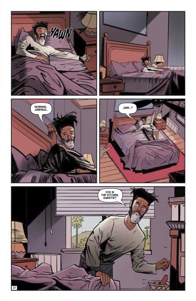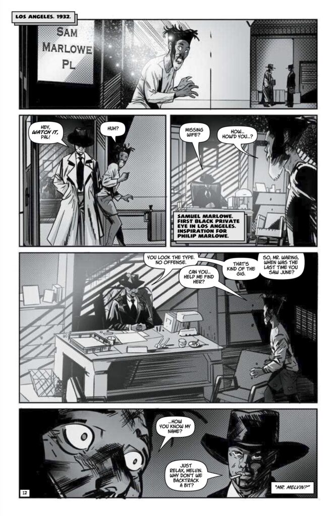 Visually, ANCESTRAL RECALL is a spectacular achievement for Atagun İlhan. The preview pages reveal a breathtaking sequence where Melvin is suddenly deposited in 1932 Los Angeles. Here, he encounters Samuel Marlowe—the first Black private eye in the city and the real-world inspiration for the fictional Philip Marlowe. The character acting captures every flinch of shock and every spark of fanatical defiance, rendered with a clarity that emphasizes the high emotional—and historical—stakes. Rendering a “different kind of time travel” that focuses on identity requires a level of artistic authority that İlhan delivers with cinematic flair.