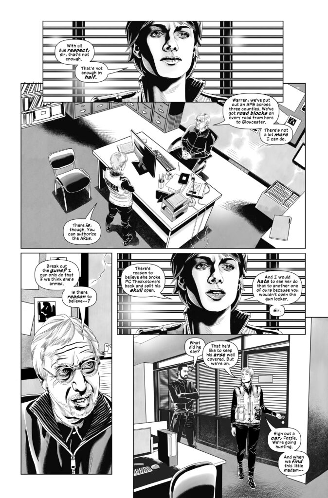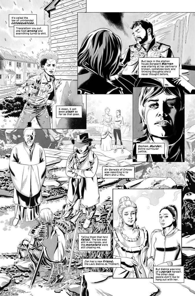 What readers should prepare for in GHOSTBOX #3 is a narrative that find its heart in the professional and spiritual vacuum of a mission gone wrong. The story centers on the “law of unintended consequences,” a principle that proves that putting one foot wrong can turn everything to ruin. The protagonist, Jan, finds herself caught in a crossfire between the physical world of Gloucester police and the metaphysical threat of the Estival. Transitioning from the quiet character study of a survivor to the sudden, visceral horror of a “soul-eating” predation, the script highlights the flexible nature of the adventure genre.