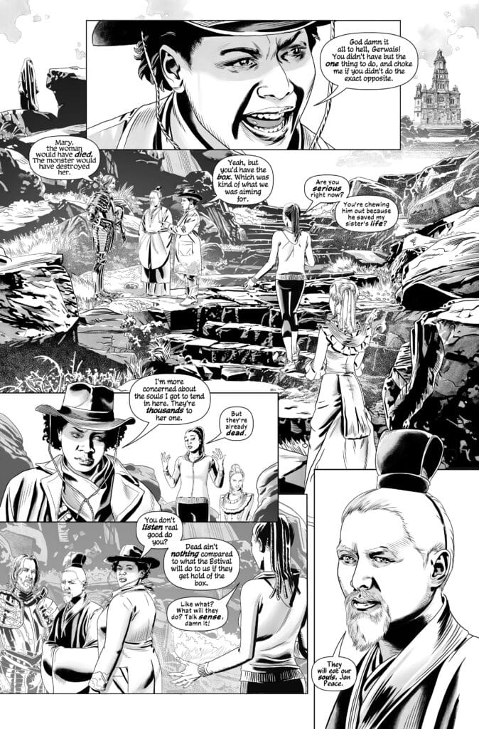 The pacing of the issue allows for a deep dive into the “process” of a spiritual autopsy. We see characters like Sir Gerwais of Orkney and the Lady Sabine de Thibhert navigating realms that are an expression of their own will. A significant complication arises as the Estival—shape-shifting entities that feed on human souls—begin their foul predation. Unlike the vibrant threats of standard capes-and-tights books, these monsters represent an absolute threat that can extinguish a being from every plane of existence. For fans who track comic book covers for their storytelling clues, the preview pages reveal a world that is as beautiful as it is lethal.