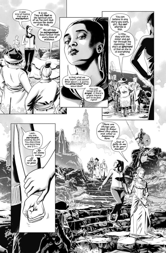Furthermore, the volume utilize the unique strengths of the black-and-white format to explore visual languages that color often obscures. Like a skilled magician, Raimondi uses the contrast to hide and reveal secrets within the shadows of the “Hand Planet” or the “Old Kingdom.” The interaction between the dialogue and the environmental storytelling provides a rhythmic tension that carries the reader through the 26-page journey. As the “seeming” of a character is stolen in the final moments, the reader is treated to a study on resilience and the fragility of identity.